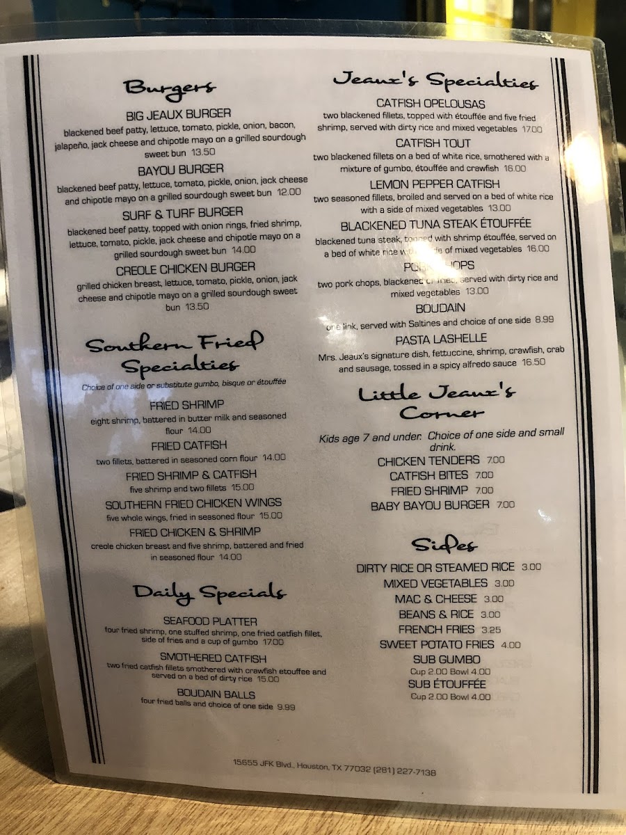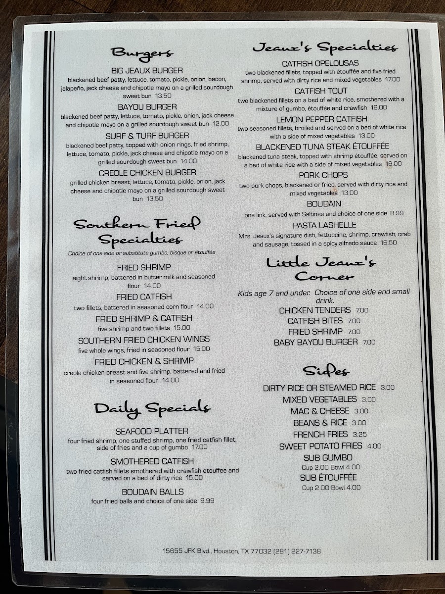 Located in Houston, Gumbo Jeaux's offers a delightful taste of Creole and Cajun cuisine. The menu is a flavorful journey, showcasing specialties like the LEMON PEPPER CATFISH and CATFISH OPELOUSAS, where the perfectly blackened fillets meet delicious etouffee and shrimp. For burger lovers, the Big Jeaux Burger is a must-try, featuring a blackened beef patty loaded with toppings.